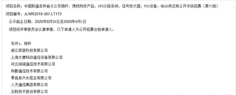 我公司于2020年6月3日 聯通入圍 ( 2019年河北聯通增高架、抱桿、鋼桿補充招募公告)